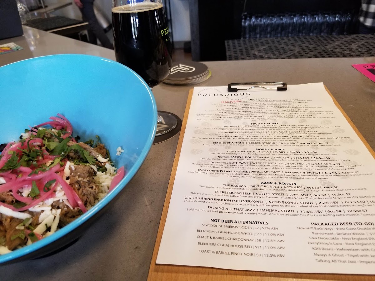 “ Stopped in for a small bite that turned into an early dinner because the Tacos are that good! It is located inside Precarious Beer Project and is counter service, you order and you pick up. Tried the Ropa Vieja and Charred Zucchini Tacos, both were delicious. Had the chips and salsa too, salsa needs a little work...being called "electric Salsa" I was expecting more "umph", but all together great food and fun place to be! ”
